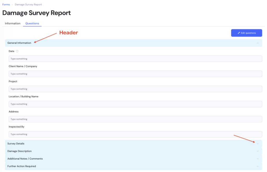 This guide explains all available question types, how to add them to a form, how to assign them to sections (headers), and how to reorder questions using drag & drop.