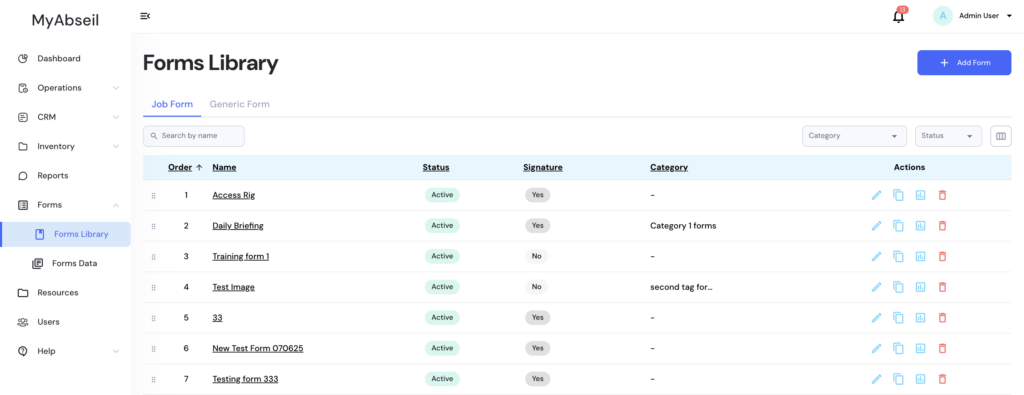 In the Forms Library menu, the admin user can create new digital forms or amend the existing ones. The forms from your Forms Library –> Job Forms, can then be allocated by your admin to your jobs, as required.