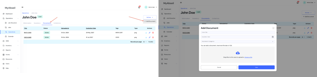 How to add operatives certifications Go to ‘Operatives’ submenu, click on an existing operative and navigate to the ‘Documents’ tab. By actioning ‘+Add Document’, you can add certifications or other documents for that operative Doc navigationHow to manage operatives certification & competence →