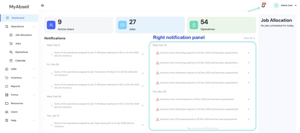 Certification expiry notifications for operatives will also be shown on the Dashboard’s right-hand notification panel—60 and 30 days before expiration, and again on the expiry date.