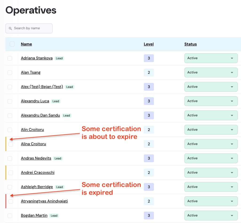 Navigate to ‘Operatives’ menu under ‘Operations’, and look for the coloured warning tags in front of the Operatives’ name: