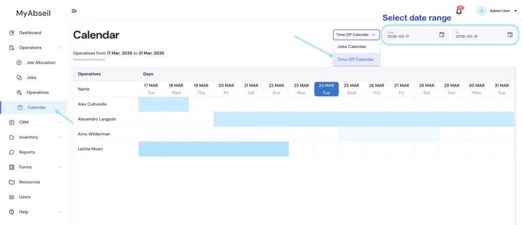 To view your operatives’ time off schedule, go to the Calendar menu, select Time Off Calendar from the dropdown, and choose your desired date range.