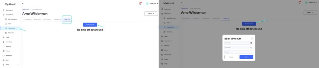 Navigate to ‘Operatives’ menu, select the required operative and go to the ‘Time Off’ tab to book time off.