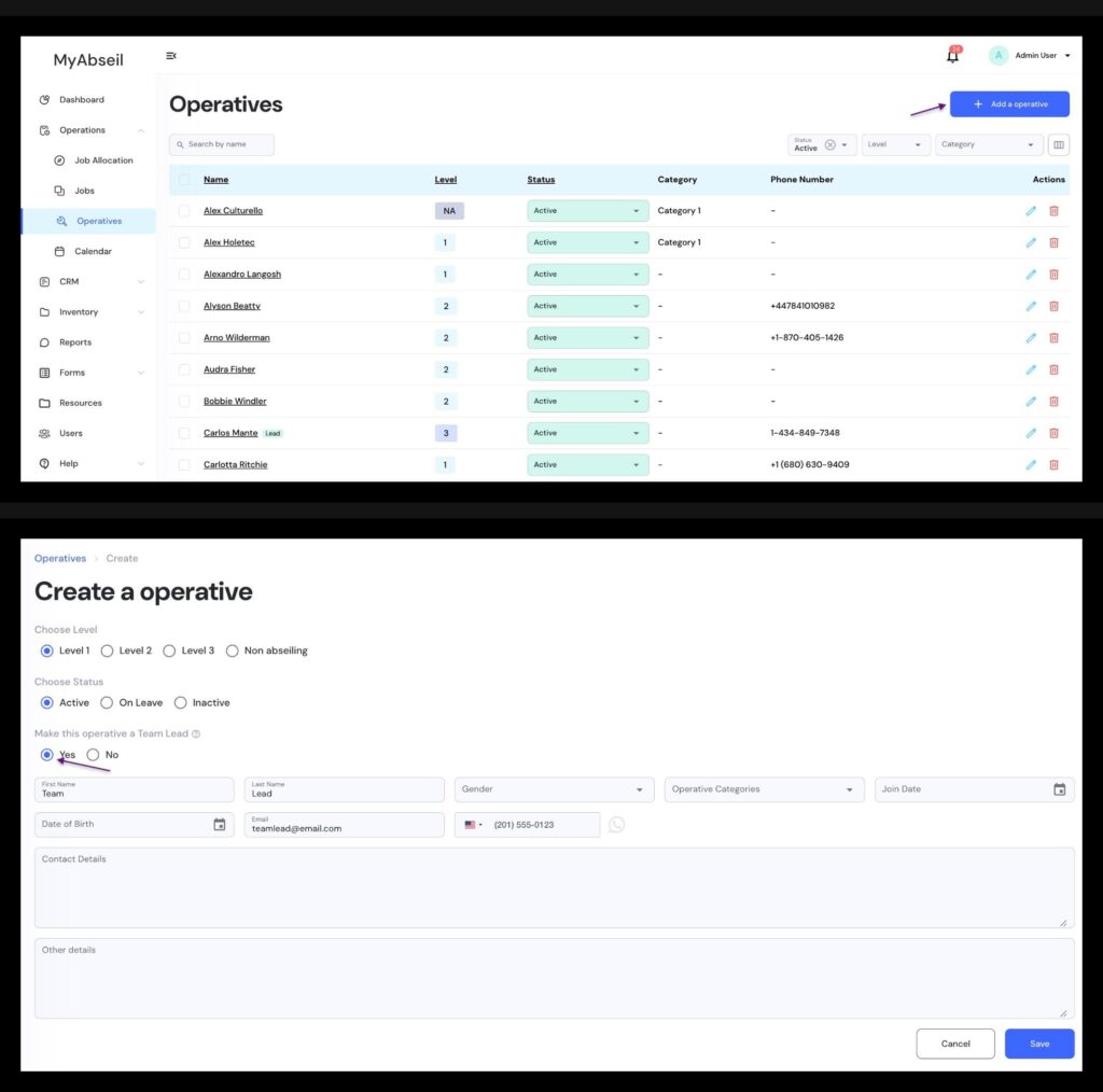 To create a new ‘Team Lead’ user go to the Operatives menu, and click +Add Operative