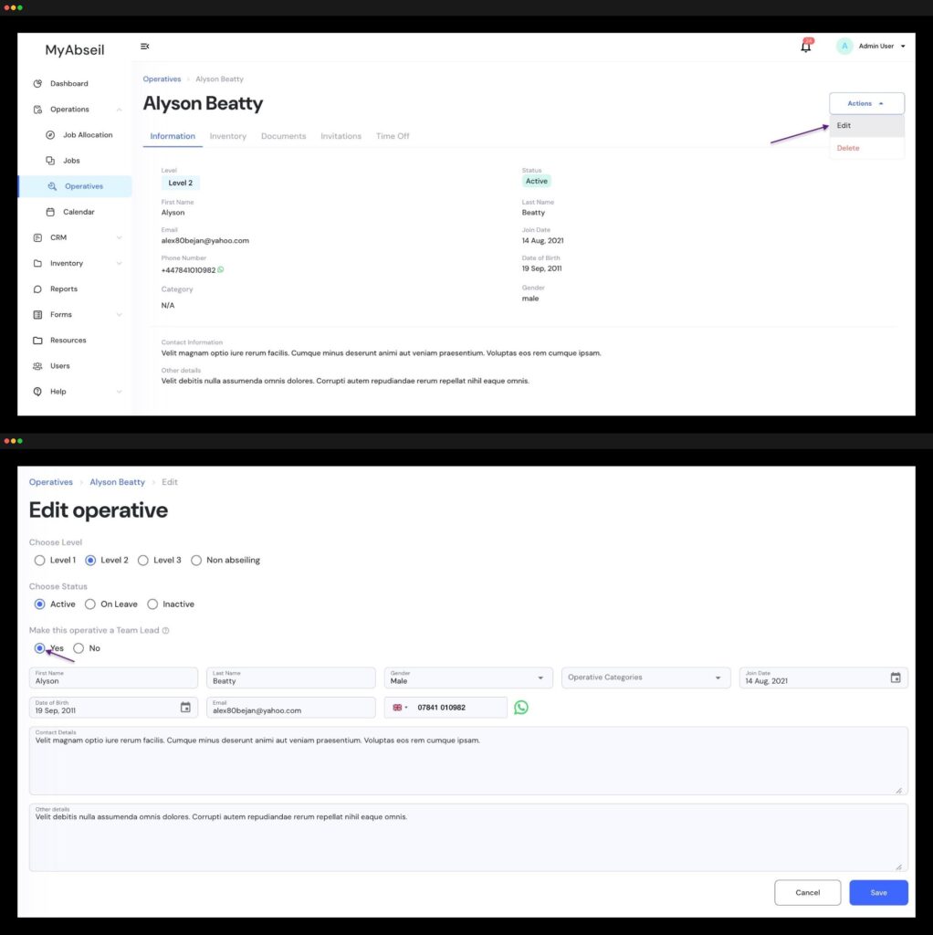 If you want to make an existing Operative a Team Lead user, go to the Operatives menu and select the required operative from the list. Click on the operative, navigate to the Action menu and select Edit. Now select ‘Make this operative a Team Lead’